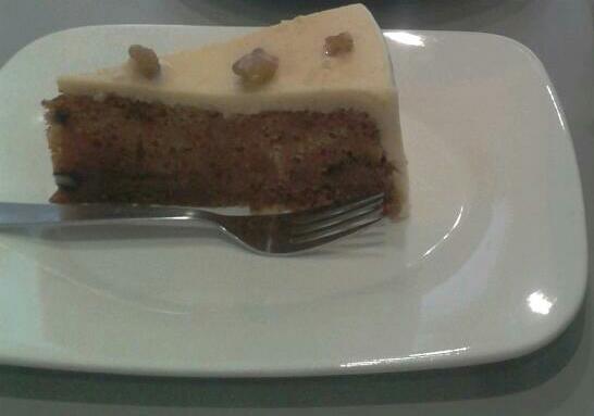 I usually skip breakfast on days at work, settling for a cup of coffee and if feeling peckish munch on biscuits from my desk's drawers. This Friday I wanted something substantial to cheer myself up and sauntered over to the Olio coffee lounge for a pick me up. Club sandwich on wholemeal bread or carrot cake? Decided on the latter which was not bad - not too sweet and studded with bits of grated carrot, sultanas and chopped walnuts. Had a flat white coffee to go with the cake. Today's brew was just a little too weak for me - I prefer my coffee to be