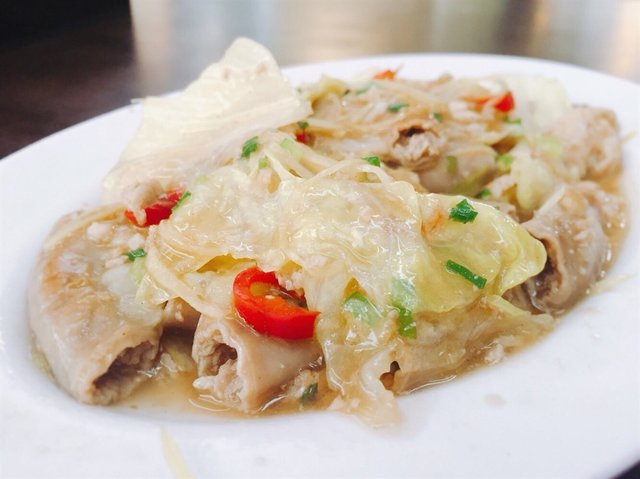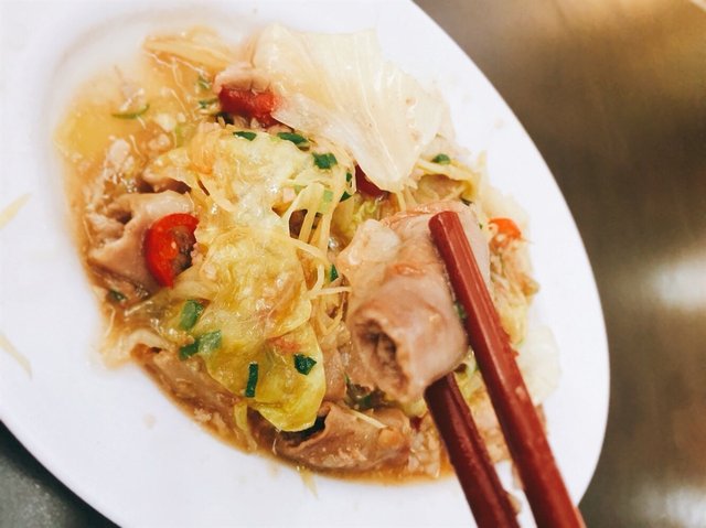 It was stir fried with lettuces, minced meat and topped with spring onions and sliced chilli. Well flavoured and slightly on the salty side, but great with porridge. The pig's intestines did not have the offending taste or smell.