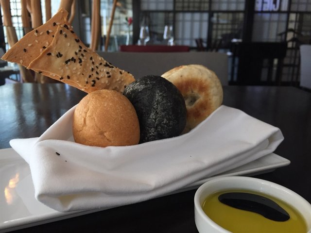 Started the meal with the bread basket, which consisted of a crusty bun, a squid ink bun, a olive bun and a couple of sesame seed crackers. It was served with olive oil and balsamic vinegar.