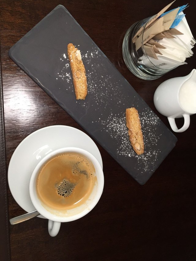 Ended the meal with a cup of rich coffee and almond biscotti.
