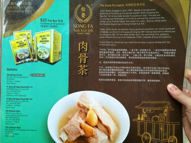 Opening its 5th branch at the Chinatown Point, Song Fa Bak Kut Teh had made their cuisine easily access to the locals and even tourists. Public transport such as MRT and bus are just nearby and this location also draw office crowds too since CBD is just nearby. I had to rush to queue during my lunch break to avoid lunch crowd. Luck is on my side indeed as i manage to have my table within 5 mins. Well, Song Fa Bak Kut Teh had been around for such a long time, they even managed to attract tourists to visit their shops. Since I did not have a chance to try their food, so I decided to drop by and decide for myself if it is good.The place is flooded with customers during lunch time, i guess it will be much worse during dinner time!!Have a look at the menuFrom main dishes to braised dishes to side dishes and drinks, you will be able to see what they have to offer at a glance Lots of waiters and waitresses can be seen, hence it is easy to catch their attentionHomemade Barley ($1.80) - Sweetness is just right. The barley are nearly mashed up, hence it is much more easier to drink with the straw Chili, dark soy sauce are providedBraised Pig's Intestines ($6.50) - At a glance, it does not really look delicious, but after I took a bite, my mind really blew off. I am bewildered by how clean the intestines are washed, absolutely no funky smell at all. The intestines are well marinated and braised, the sauce can be tasted when you chew at the intestine. Braised sauce is savoury but not overwhelming. Highly recommended to order!Premium Loin Ribs ($9.50) - Wow, this is really an expensive premium dish. The meat is very tender, easily to separate the meat from the bones. Well marinated and tasty too. The soup is very peppery and taste of garlic and peppers. However, the broth lack of the sweetness from the meat which is what I am looking for. I am really disappointed with it. This is just a dish which the ribs and the soup are prepared separately. Totally no fusion at all. Remember to return the wet tissue if you do not require it, it will be deducted off your billThere are 2 queues which are operating simultaneously, one is located at the front door while the other queue are located in the shopping mall itself. I will suggest to queue inside the shopping mall since there are air con compare to the front door queue. (Inside shopping mall queue)Verdict: 3.5 /5The taste of the food are fairly usual, I don not feel that there are any "wow" factor. Although the Pig's intestines and the loin ribs are are good, it somehow lack the flavour that I am looking for.Service provided by the staff are prompt and courteous, i am surprised since they appeared to be so busy and chaotic at times. Good job there!!Considering the price of the food sold here, I find it abit steep. Overall, I may not come back here again. Recommend for 1st timer only. Taste(3)Environment(4)Service(4)Clean(4)Price(3)Look out for my other Reviews on Bak Kut TehNew Soon Huat Bak Kut Teh 新順發肉骨茶 - Click HereOutram Park Ya Hua Rou Gu Cha - 欧南园亚华肉骨茶 - Click Here…查看更多
