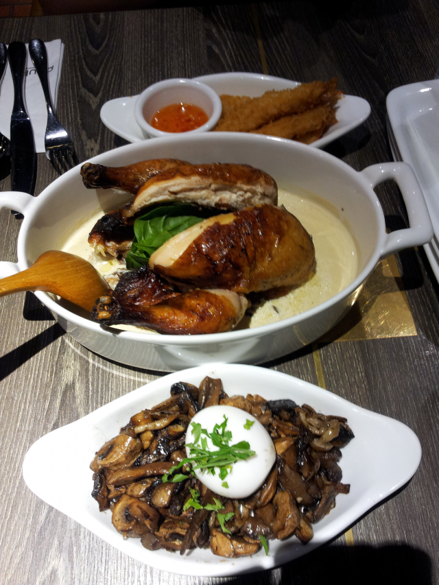 Their signature roasted chicken was succulent and the mushroom Chardonnay sauce was delicious. I will recommend pairing up the chicken with the saute mushroom and poached egg. The prawn fritters was a miss, nothing to wow about. Overall, worth trying though I won't want to queue for more than ten minutes for the food because it's simple chicken fare that's like homecooked food.…查看更多