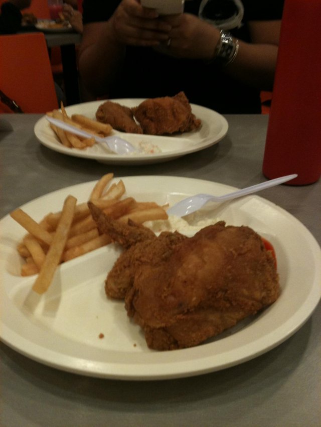 because of the super fresh juicy fried chicken. The 2 pc chix meal which I ordered includes fries and coleslaw. Colelslaw tasted freshly made. Not forgetting the fried calamaris, fried chips..super super nice.... Lol!I would give them the thumbs up for all they have in the menu. MUST MUST TRY!